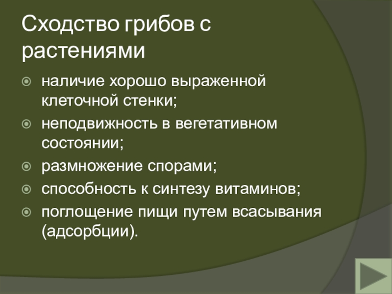 Сходство грибов с растенияминаличие хорошо выраженной клеточной стенки; неподвижность в вегетативном состоянии; размножение спорами; способность к синтезу витаминов; поглощение