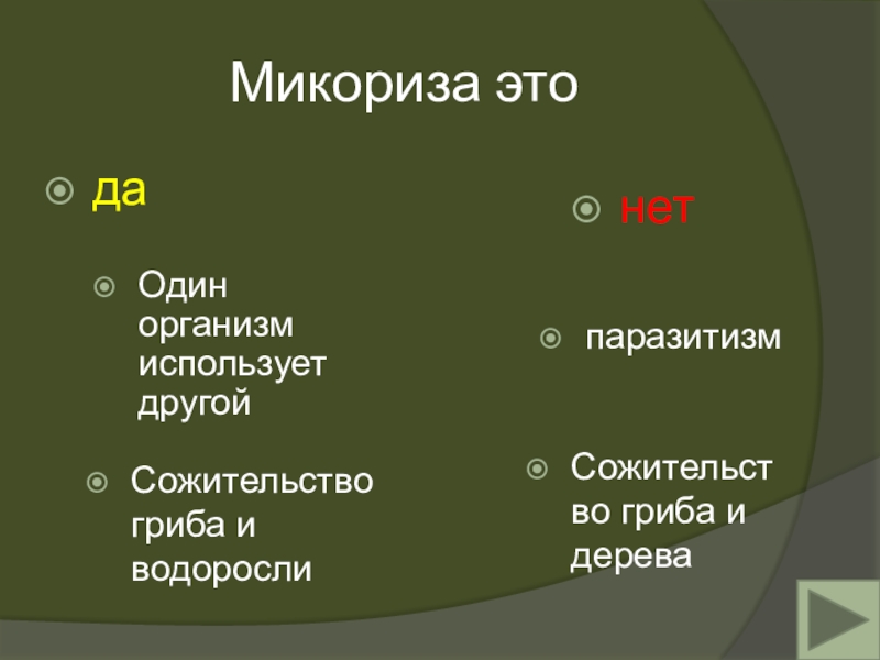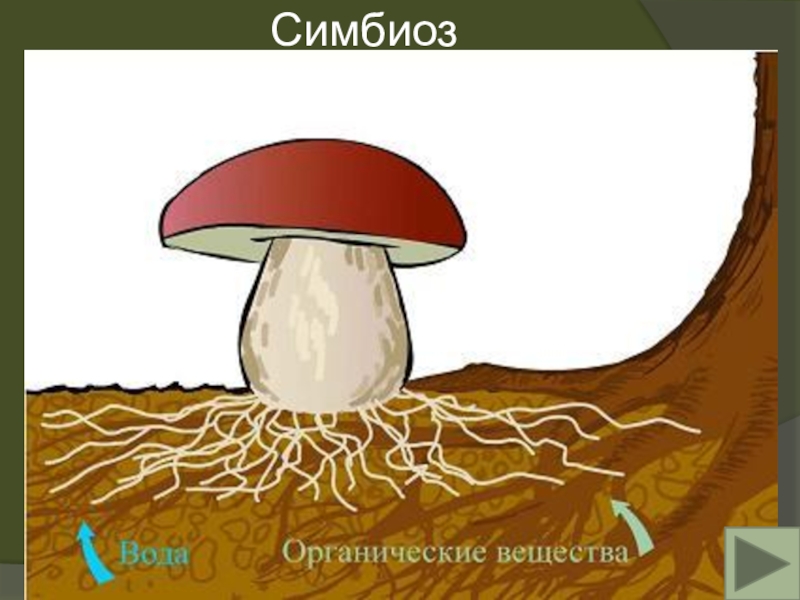 Микориза этодаОдин организм использует другойпаразитизмСожительство гриба и водорослиСожительство гриба и дереванет