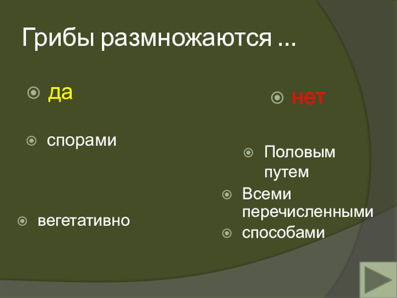 Грибы размножаются …давегетативнонетВсеми перечисленнымиспособамиПоловым путемспорами