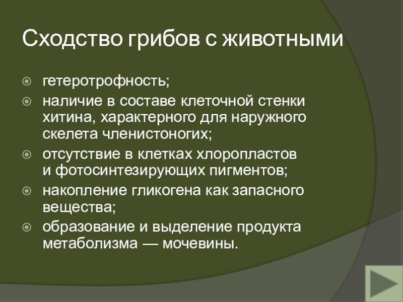 Сходство грибов с животнымигетеротрофность; наличие в составе клеточной стенки хитина, характерного для наружного скелета членистоногих; отсутствие в клетках хлоропластов