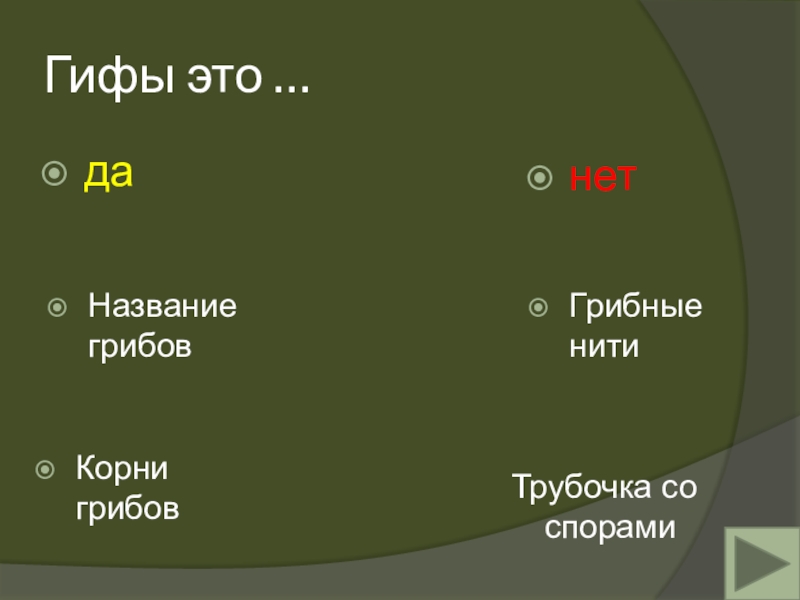 Гифы это …даГрибные нитиНазвание грибовКорни грибовнетТрубочка со спорами