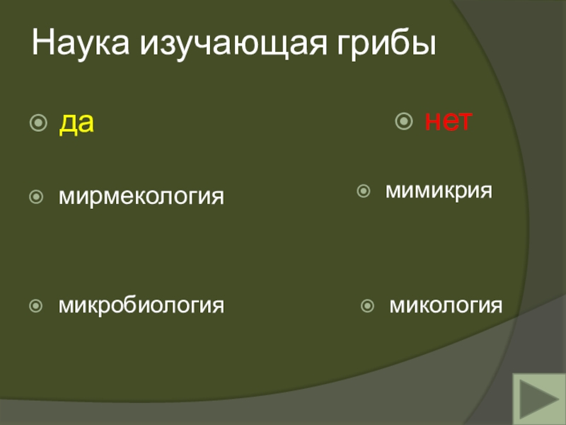 Наука изучающая грибыдамикробиологиямикологиямирмекологиянетмимикрия