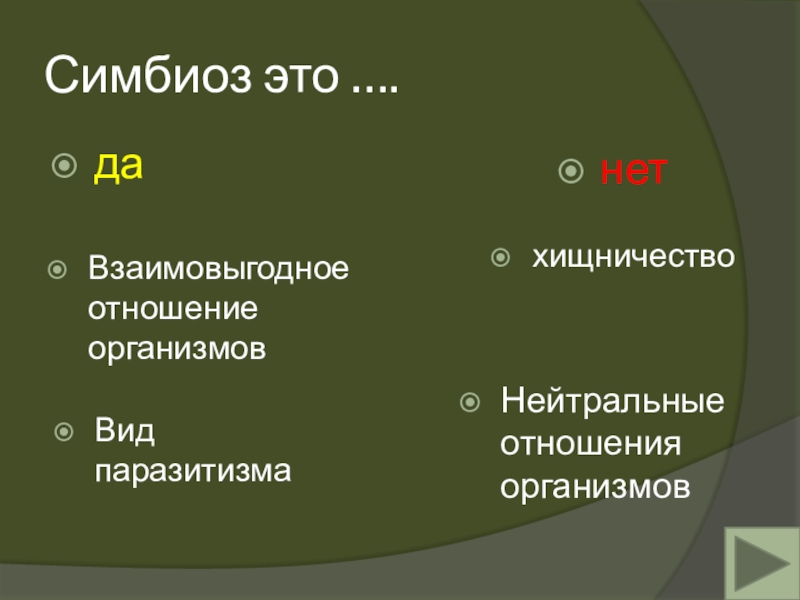Симбиоз это ….Вид паразитизмаВзаимовыгодное отношение организмовнетдахищничествоНейтральные отношения организмов