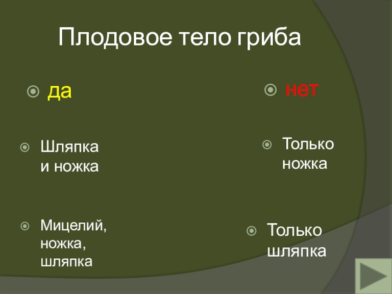 Плодовое тело гриба даТолько ножкаШляпка и ножкаМицелий, ножка, шляпканетТолько шляпка