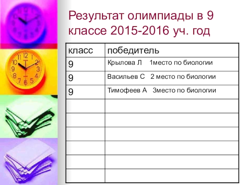 Слайд 39Результат олимпиады в 9 классе 2015-2016 уч. год