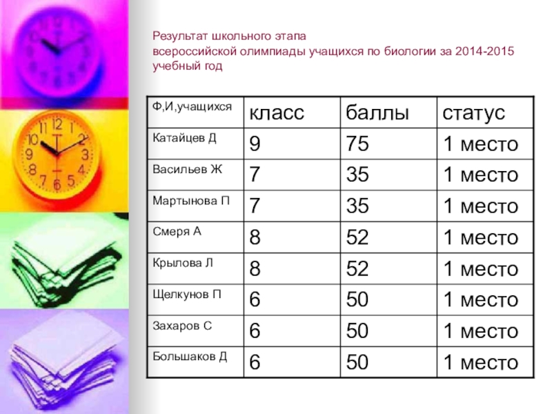 Слайд 7Результат школьного этапа всероссийской олимпиады учащихся по биологии за 2014-2015 учебный год
