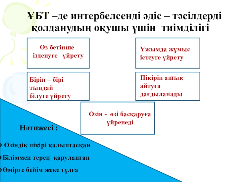 Интербелсенді әдіс – тәсілдердің сабақта және ҰБТ – ге дайындау барысында қолданылу жолдарымен таныстыру;