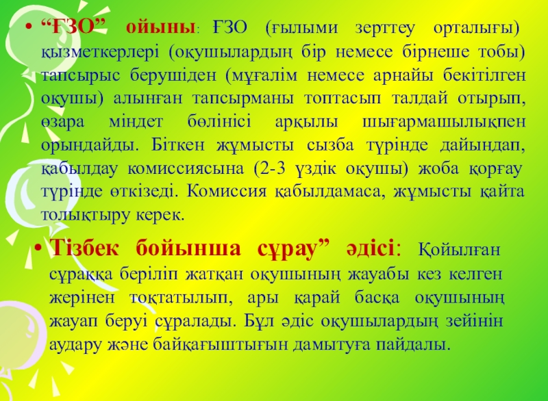 Тізбек бойынша сұрау” әдісі: Қойылған сұраққа беріліп жатқан оқушының жауабы кез келген жерінен тоқтатылып, ары қарай басқа оқушының жауап беруі сұралады. Бұл әдіс оқушылардың зейінін аудару және байқағыштығын дамытуға пайдалы.
