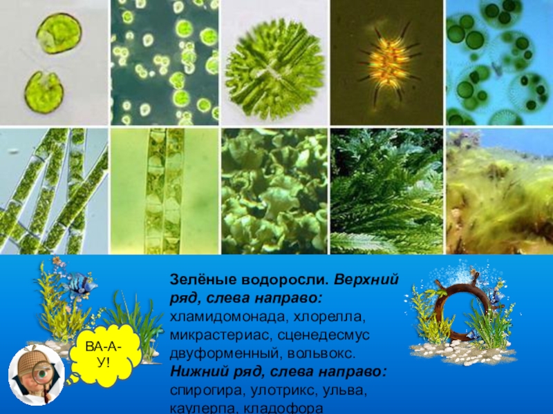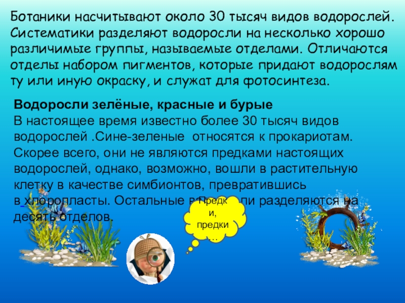 В настоящее время известно более 30 тысяч видов водорослей .Сине-зеленые относятся к прокариотам. Скорее всего, они не являются предками настоящих водорослей, однако, возможно, вошли в растительную клетку в качестве симбионтов, превратившись в хлоропласты. Остальные водоросли разделяются на десять отделов.