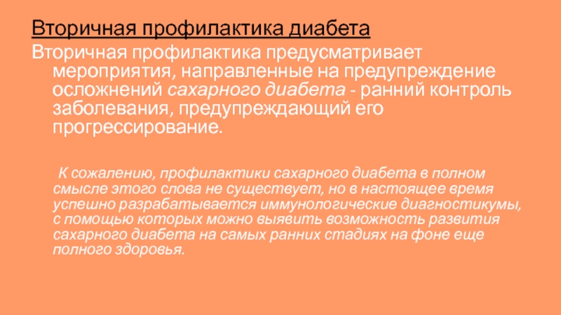 Вторичная профилактика предусматривает мероприятия, направленные на предупреждение осложнений сахарного диабета -