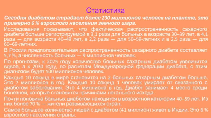 Каждые 10 секунд в мире становится на 2 больных сахарным диабетом больше. Это 7 миллионов в год. Каждые 10 секунд 1 человек умирает от связанного с диабетом заболевания. Это 4 миллиона в год. Диабет занимает 4 место среди болезней, которые становятся причинами летального исхода.
