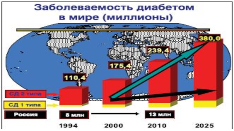 В России предположительная распространенность сахарного диабета составляет 5,7 %, а численность больных — 9 миллионов человек.