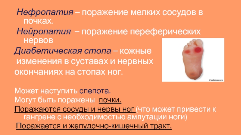 Слайд 8 Нефропатия – поражение мелких сосудов в почках.