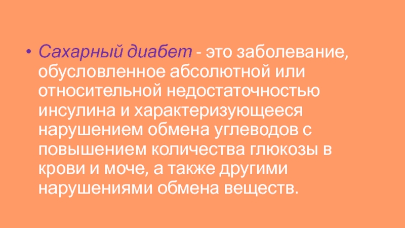 Слайд 3Сахарный диабет - это заболевание, обусловленное абсолютной или относительной недостаточностью инсулина и