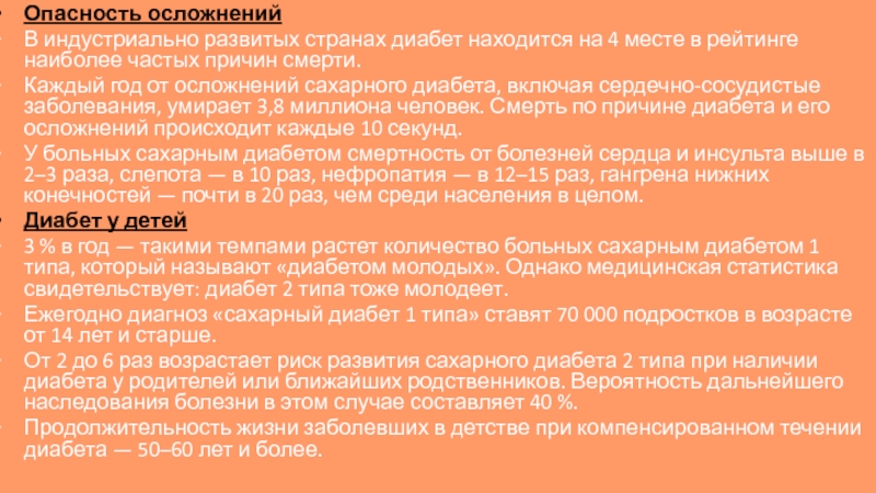 У больных сахарным диабетом смертность от болезней сердца и инсульта выше в 2–3 раза, слепота — в 10 раз, нефропатия — в 12–15 раз, гангрена нижних конечностей — почти в 20 раз, чем среди населения в целом.