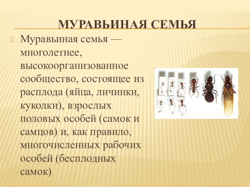 Муравьиная семья — многолетнее, высокоорганизованное сообщество, состоящее из расплода (яйца, личинки,
