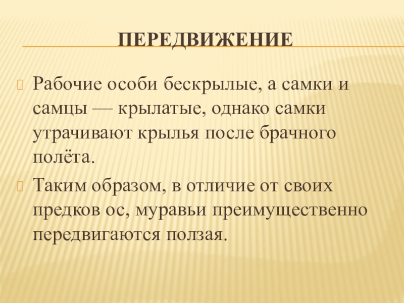 Таким образом, в отличие от своих предков ос, муравьи преимущественно передвигаются ползая.