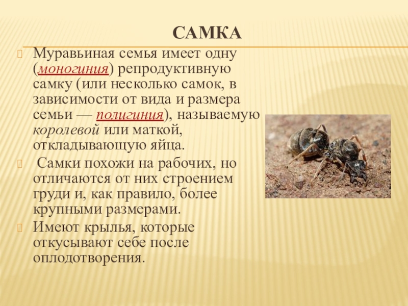 Муравьиная семья имеет одну (моногиния) репродуктивную самку (или несколько самок, в