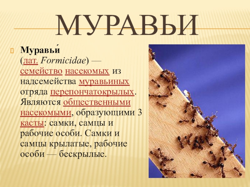 Муравьи́ (лат. Formicidae) — семейство насекомых из надсемейства муравьиных отряда перепончатокрылых. Являются общественными