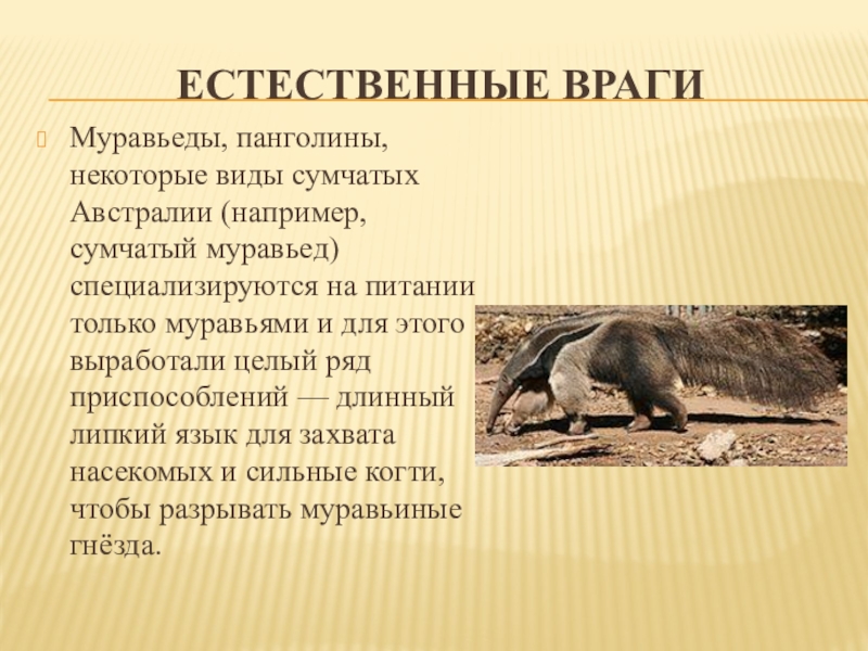 на питании только муравьями и для этого выработали целый ряд приспособлений — длинный липкий язык для захвата насекомых и сильные когти, чтобы разрывать муравьиные гнёзда.