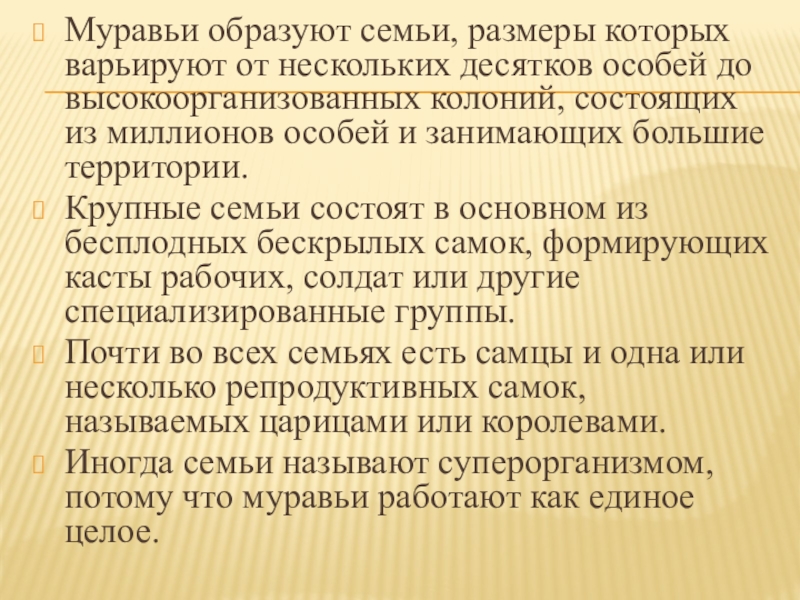 Слайд 6Муравьи образуют семьи, размеры которых варьируют от нескольких десятков особей до