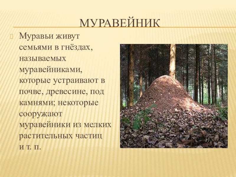 Муравьи живут семьями в гнёздах, называемых муравейниками, которые устраивают в почве,