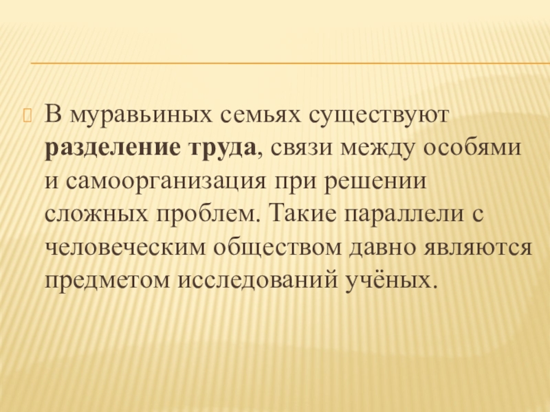 Слайд 7В муравьиных семьях существуют разделение труда, связи между особями и самоорганизация