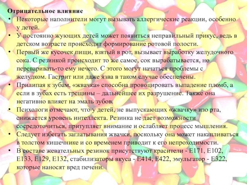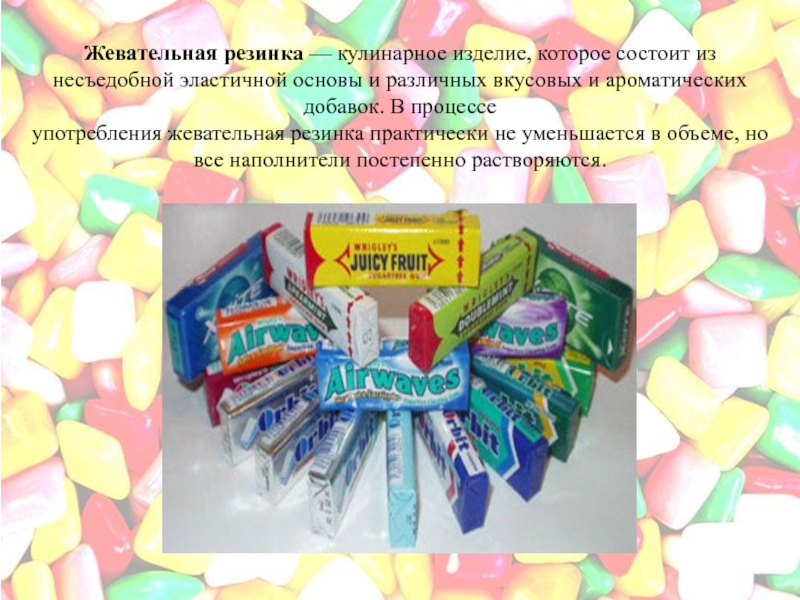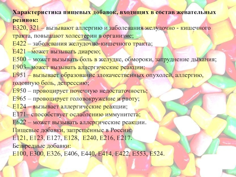 стабилизатор E422, натуральные, идентичные натуральным и искусственные ароматизаторы, маннит E421, эмульгатор соевый лецитин, краситель E171, подсластители аспартам E951, ацесульфам E950, гидрокарбонат натрия E500ii, глазурь E903, антиоксидант E320.