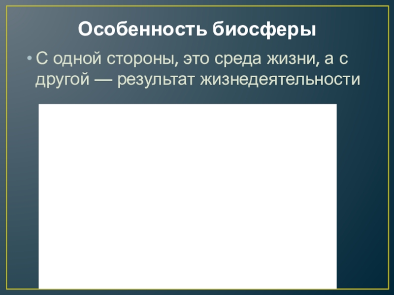 Особенность биосферыС одной стороны, это среда жизни, а с другой — результат жизнедеятельности