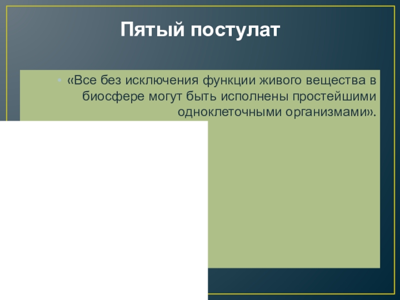Пятый постулат«Все без исключения функции живого вещества в биосфере могут быть исполнены простейшими одноклеточными организмами».