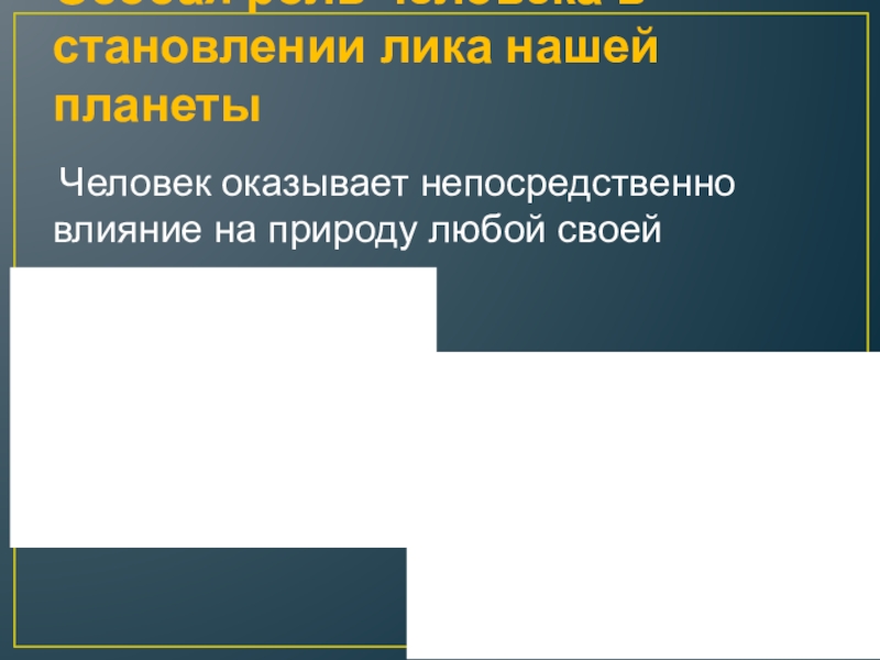 Особая роль человека в становлении лика нашей планеты Человек оказывает непосредственно влияние на природу любой своей деятельностью.