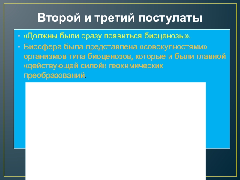 Второй и третий постулаты«Должны были сразу появиться биоценозы». Биосфера была представлена «совокупностями» организмов типа биоценозов, которые и