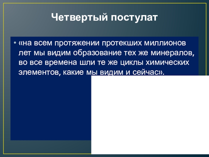 Четвертый постулат«на всем протяжении протекших миллионов лет мы видим образование тех же минералов, во все времена шли