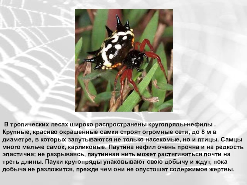Слайд 12 В тропических лесах широко распространены кругопряды-нефилы . Крупные, красиво окрашенные