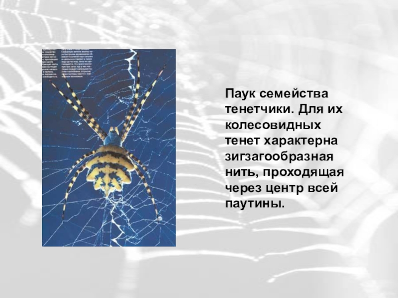 Слайд 16Паук семейства тенетчики. Для их колесовидных тенет характерна зигзагообразная нить, проходящая