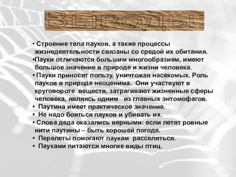 Пауки приносят пользу, уничтожая насекомых. Роль пауков в природе неоценима. Они участвуют в круговороте веществ, затрагивают жизненные сферы человека, являясь одним из главных энтомофагов.