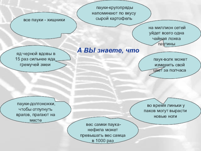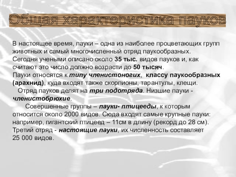 процветающих групп животных и самый многочисленный отряд паукообразных. Сегодня учеными описано около 35 тыс. видов пауков и, как считают это число должно возрасти до 50 тысяч.