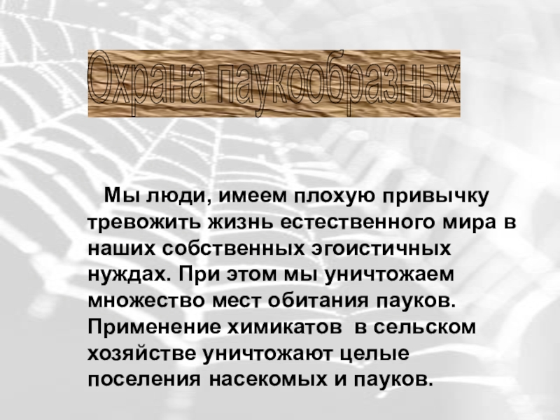в наших собственных эгоистичных нуждах. При этом мы уничтожаем множество мест обитания пауков. Применение химикатов в сельском хозяйстве уничтожают целые поселения насекомых и пауков.