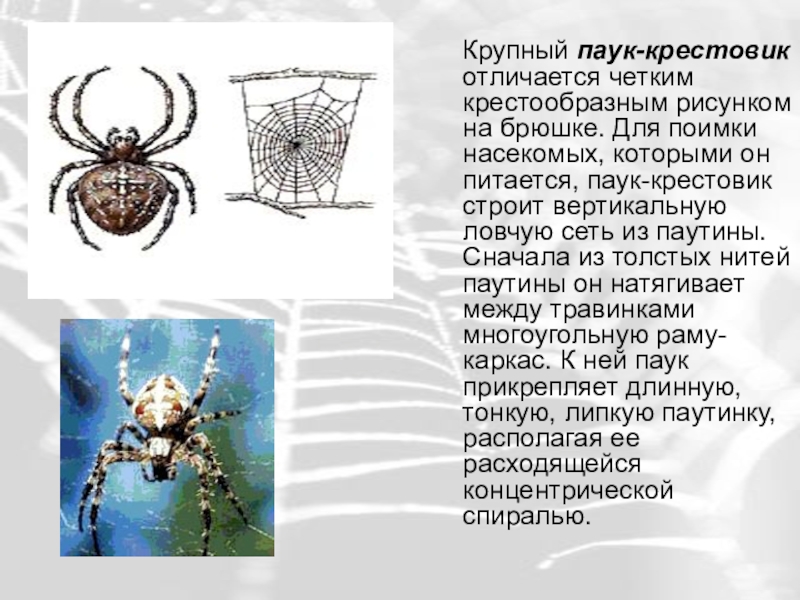 Слайд 17 Крупный паук-крестовик отличается четким крестообразным рисунком на брюшке. Для
