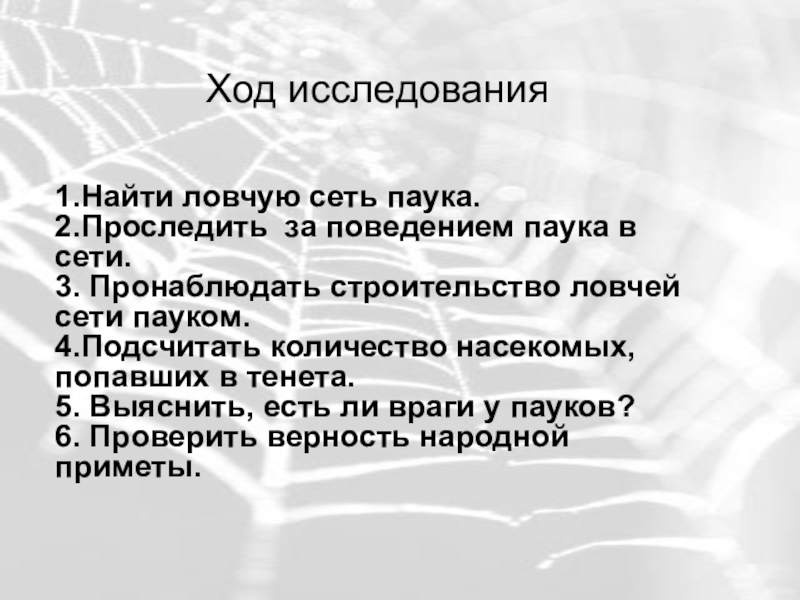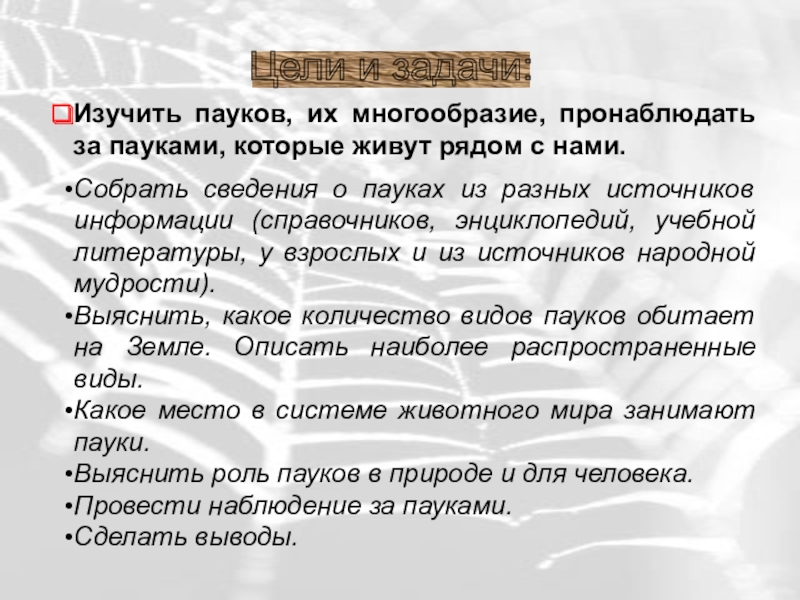 Изучить пауков, их многообразие, пронаблюдать за пауками, которые