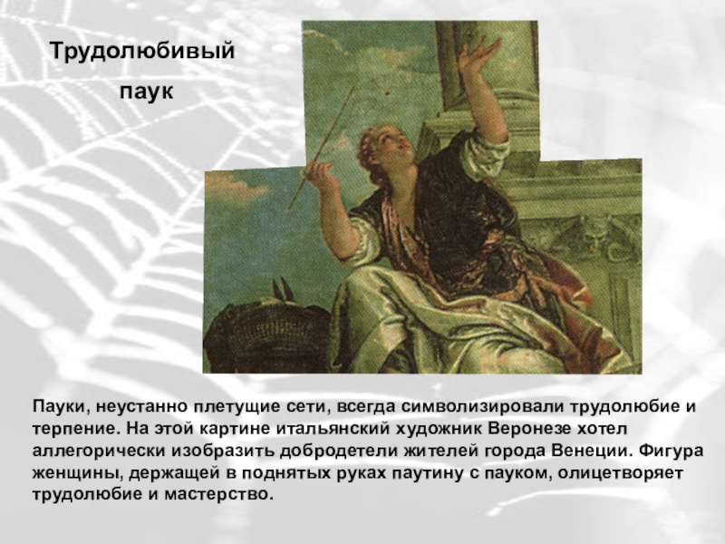 этой картине итальянский художник Веронезе хотел аллегорически изобразить добродетели жителей города Венеции. Фигура женщины, держащей в поднятых руках паутину с пауком, олицетворяет трудолюбие и мастерство.