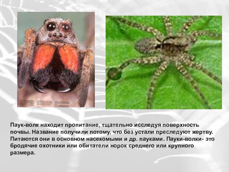 Слайд 14Паук-волк находит пропитание, тщательно исследуя поверхность почвы. Название получили потому, что