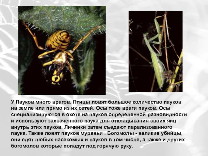 или прямо из их сетей. Осы тоже враги пауков. Осы специализируются в охоте на пауков определенной разновидности и используют захваченного паука для откладывания своих яиц внутрь этих пауков. Личинки затем съедают парализованного паука. Также ловят пауков муравьи . Богомолы - великие убийцы, они едят любых насекомых и пауков в том числе, а также и других богомолов которые попадут под горячую руку.