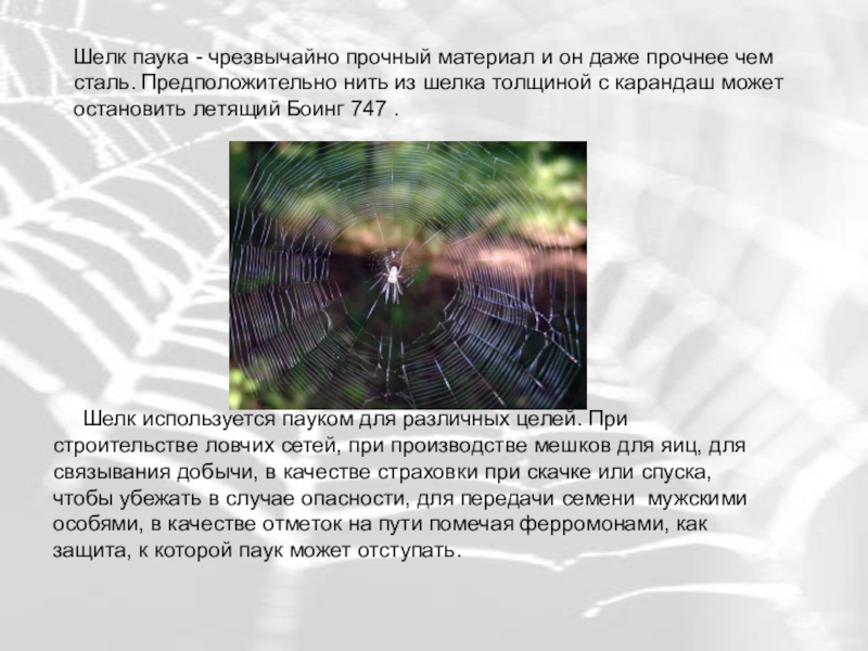 Слайд 27Шелк паука - чрезвычайно прочный материал и он даже прочнее чем