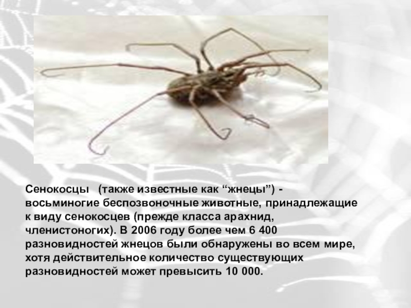 к виду сенокосцев (прежде класса арахнид, членистоногих). В 2006 году более чем 6 400 разновидностей жнецов были обнаружены во всем мире, хотя действительное количество существующих разновидностей может превысить 10 000.
