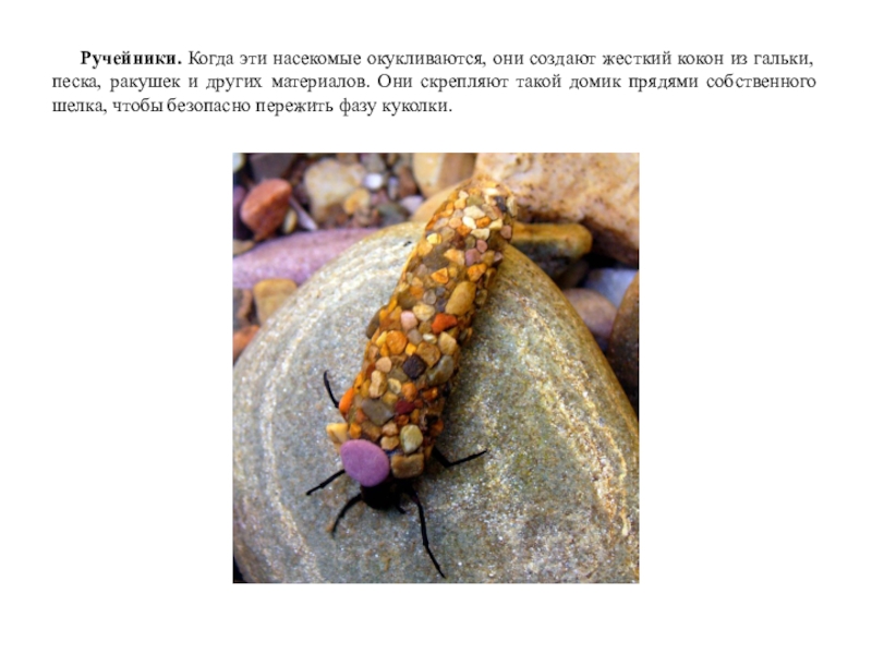 Слайд 29 Ручейники. Когда эти насекомые окукливаются, они создают жесткий кокон