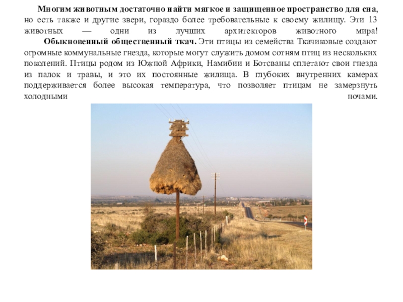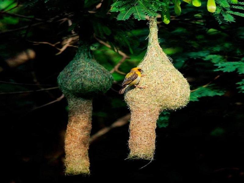 Обыкновенный общественный ткач. Эти птицы из семейства Ткачиковые создают огромные коммунальные гнезда, которые могут служить домом сотням птиц из нескольких поколений. Птицы родом из Южной Африки, Намибии и Ботсваны сплетают свои гнезда из палок и травы, и это их постоянные жилища. В глубоких внутренних камерах поддерживается более высокая температура, что позволяет птицам не замерзнуть холодными ночами.
