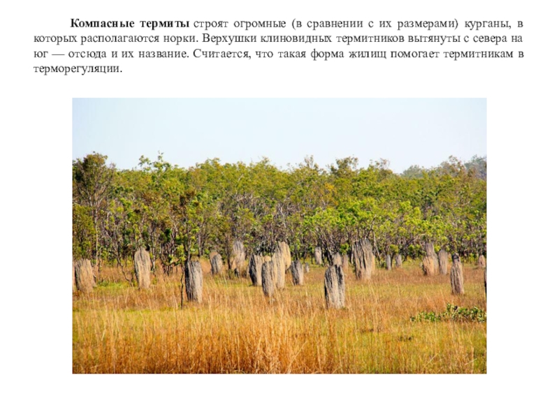 размерами) курганы, в которых располагаются норки. Верхушки клиновидных термитников вытянуты с севера на юг — отсюда и их название. Считается, что такая форма жилищ помогает термитникам в терморегуляции.