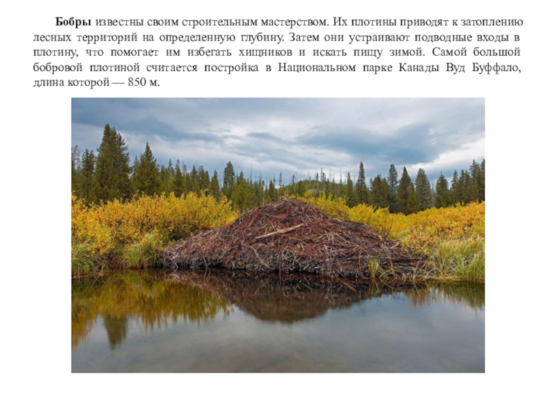 Слайд 23 Бобры известны своим строительным мастерством. Их плотины приводят