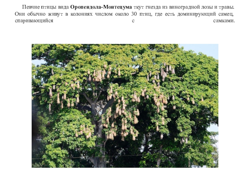 Певчие птицы вида Оропендола-Монтецума ткут гнезда из виноградной лозы и